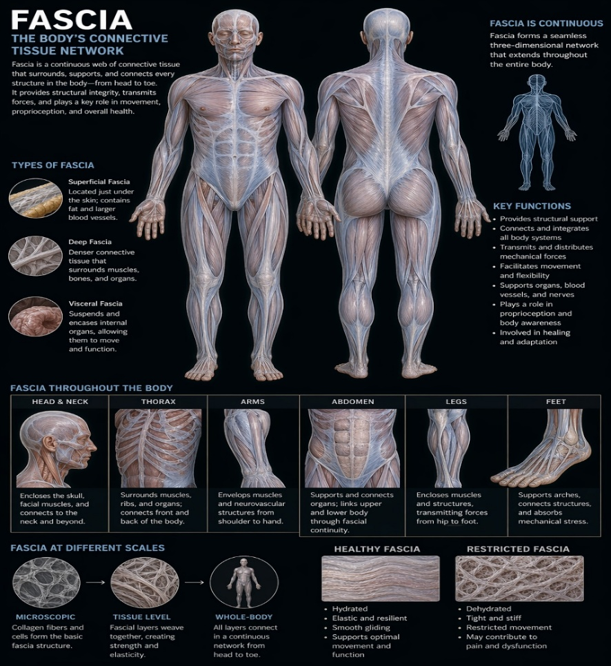 Fascia is continuous 3D web of connective tissue that surrounds muscles, joints, organs, nerves and blood vessels. It holds the body together as one integrated system.